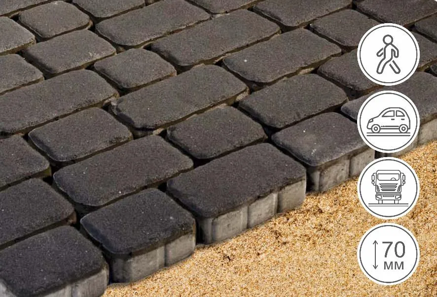 Элементы разного размера позволяют создать иллюзию старинной мостовой из натурального камня. При этом разнообразие цветового оформления плитки дает возможность гармонично "вписывать" дорожки в общий архитектурный и ландшафтный дизайн всего приусадебного комплекса.